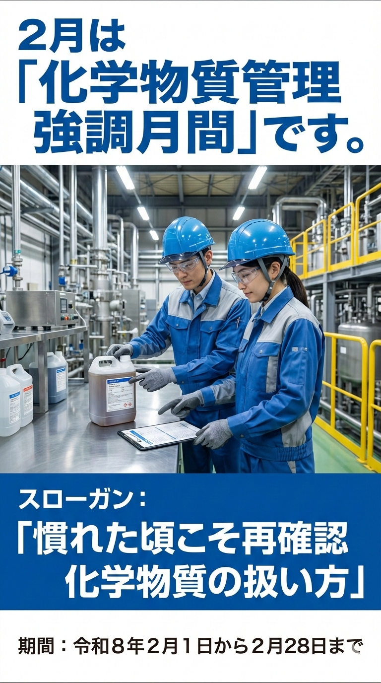 厚生労働省は「慣れた頃こそ再確認、化学物質の扱い方」をスローガンとして、2月に「化学物質管理強調月間」を実施します。化学物質管理者による化学物質管理の徹底等、化学物質管理体制の構築を最重点事項とし、事業者及び労働者が連携・協力して、日常の化学物質管理の総点検を行うことを呼びかけています。